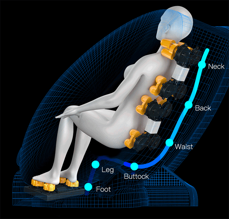 【SL TRACK ROLLERS DESIGN】The intelligent massage chair has Double SL Track ergonomically designed to perfectly fit the body’s curves, it not only has a larger massage range but also achieves precise knocking, shiatsu, kneading, tapping, and clapping to relax your whole body, combining the Thai-style/Yoga Stretching massage to perform a better massage experience.